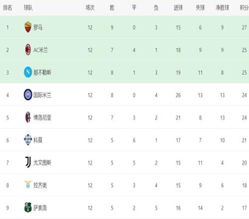 在积分榜上,罗马排名榜首。罗马的战绩是9胜3负,拿到27分。AC米兰和那不勒斯都是25分,排名第2和第3。第4的是国际米兰,8胜4负,拿到24分。博洛尼亚也是24分,排名第5。科莫这场赢下之后,总积分达到21分,升到了第6名,超越了20个积分的尤文图斯。拉齐奥只拿到18分,排名第8。亚特兰大是本赛季强队中下滑最严重的,只拿到13分,排名第13。